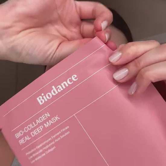 Le masque Biodance Bio-Collagen Real Deep Sheet resserre les pores et hydrate instantanément. L'essence 34G pénètre en profondeur pour un teint ferme et éclatant. Résultats visibles rapidement et pores diminués. Le soin expert pour une peau resplendissante." Ce masque au collagène probiotique contient: - 50 000 PPM de filtrat de ferment Galactomyces : pour favoriser l'hydratation, l'élasticité et l'éclat de la peau - 50 000 PPM de collagène de très faible poids moléculaire : pour maximiser la pénétration et l'absorption - 5 % d'acide oligohyaluronique : pour un puissant effet hydratant instantané - Triple complexe probiotique : régule l'équilibre entre les bactéries bénéfiques et nocives, contribuant à la vitalité de la peau